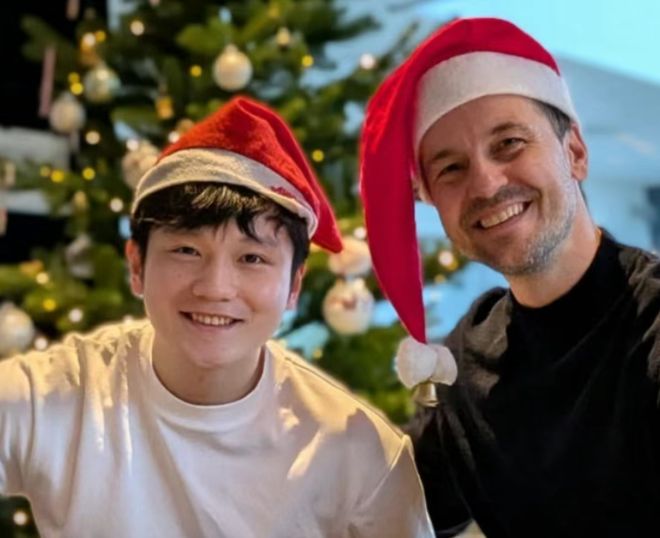 12月25日未明、樊振東がドイツでティモ・ボルとサンタ帽をかぶっているツーショット写真をSNSに投稿。