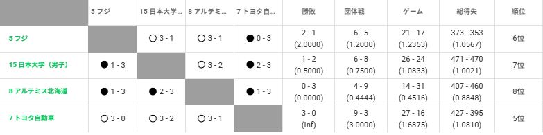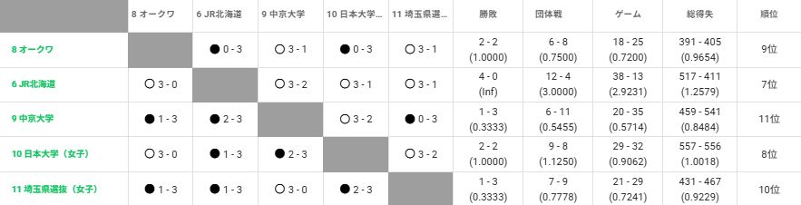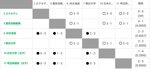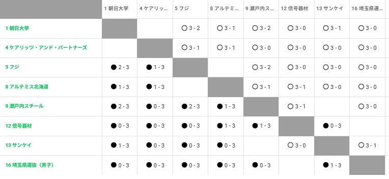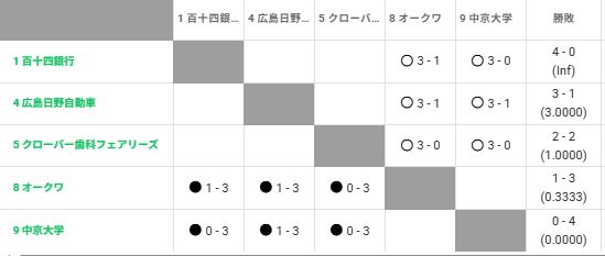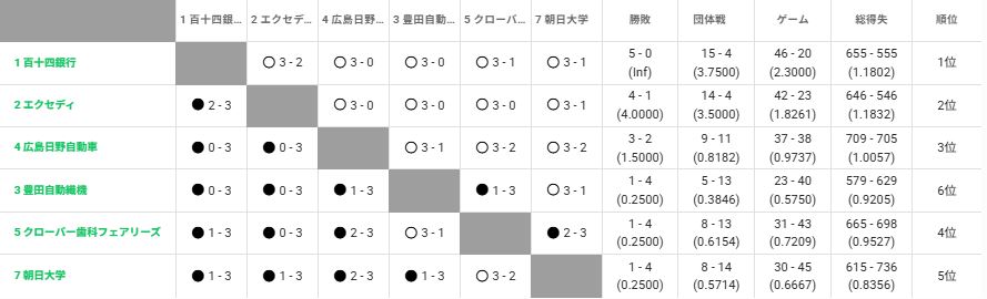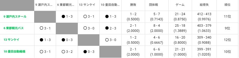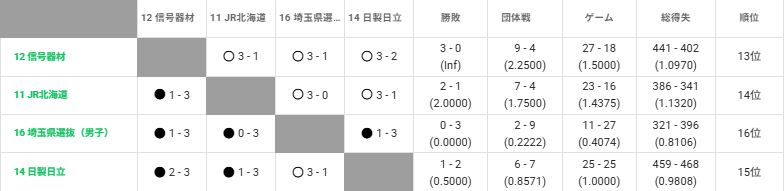 | 15:15 | 15・16 | 男子1部-第3試合 | 協和キリン VS 関西卓球アカデミー |