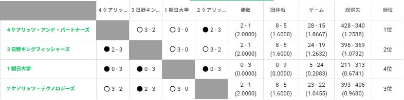 | 15:15 | 7・8 | 男子1部-第4試合 | クローバー歯科カスピッズ VS 関西卓球アカデミー |