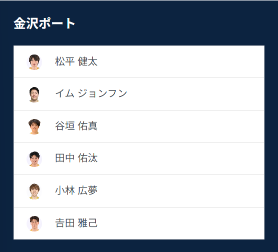 | 金沢ポート | 0 小林 広夢 1 吉田 蒼 10 チャン ウジン 11 松平 健太 16 徳田 幹太 18 谷垣 佑真 30 吉田 雅己 34 イム ジョンフン 38 パク ギュヒョン 81 田中 佑汰 |
