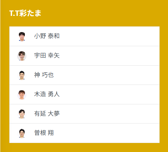 | T.T彩たま | 1 小野 泰和 5 オ ジュンソン 8 宇田 幸矢 11 渡部 民人 12 飯村 悠太 15 神 巧也 26 木造 勇人 30 髙見 真己 37 有延 大夢 77 曽根 翔 |
